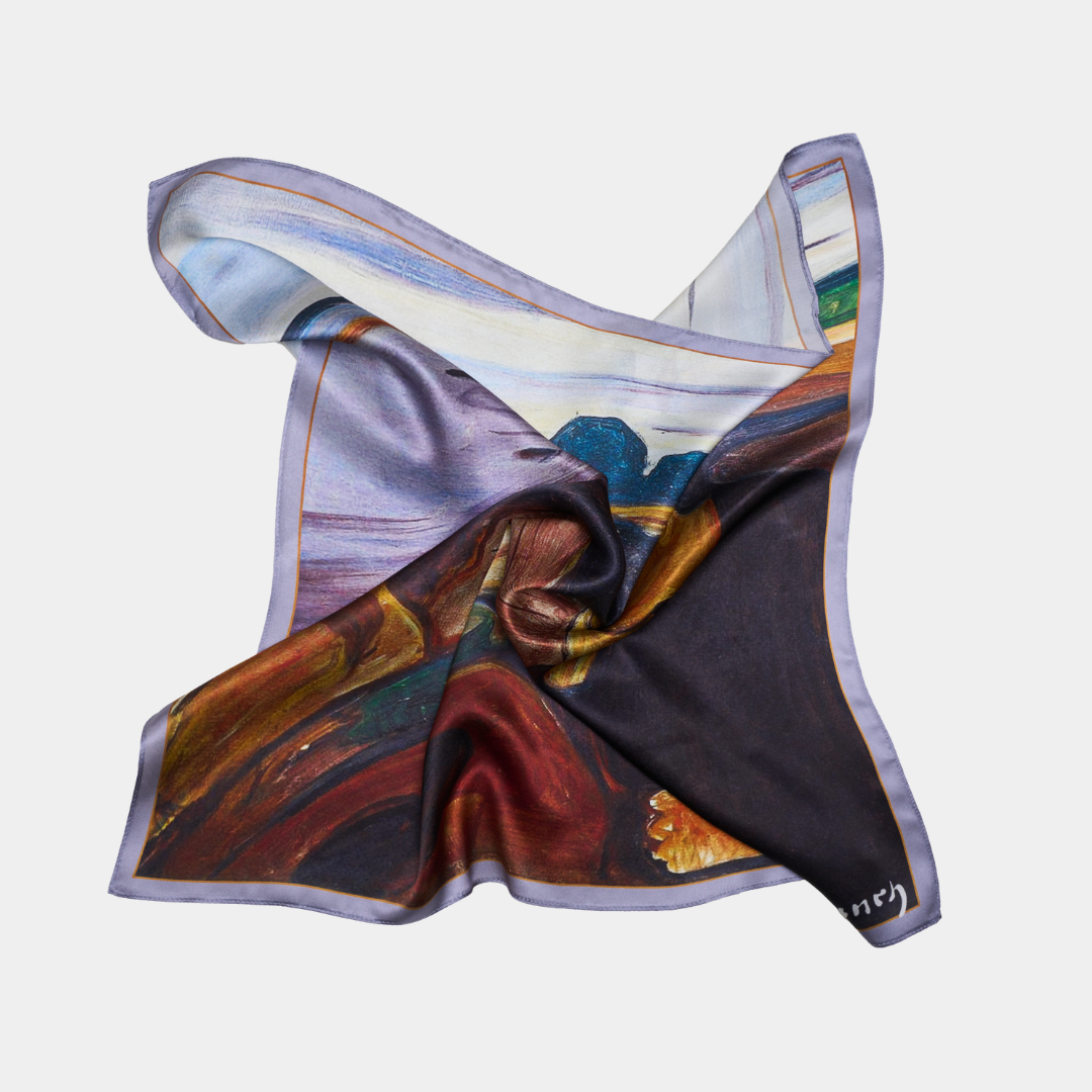 Edvard Munch – viens no ievērojamākajiem ekspresionisma pamatlicējiem, kura daiļrade apbur ar emocionālu intensitāti, dramatismu un eksistenciāla nemiera atspoguļojumu. Viņa gleznas, kas ataino cilvēka iekšējos pārdzīvojumus un dvēseles dziļumus, atdzīvojas greznos zīda lakatos.