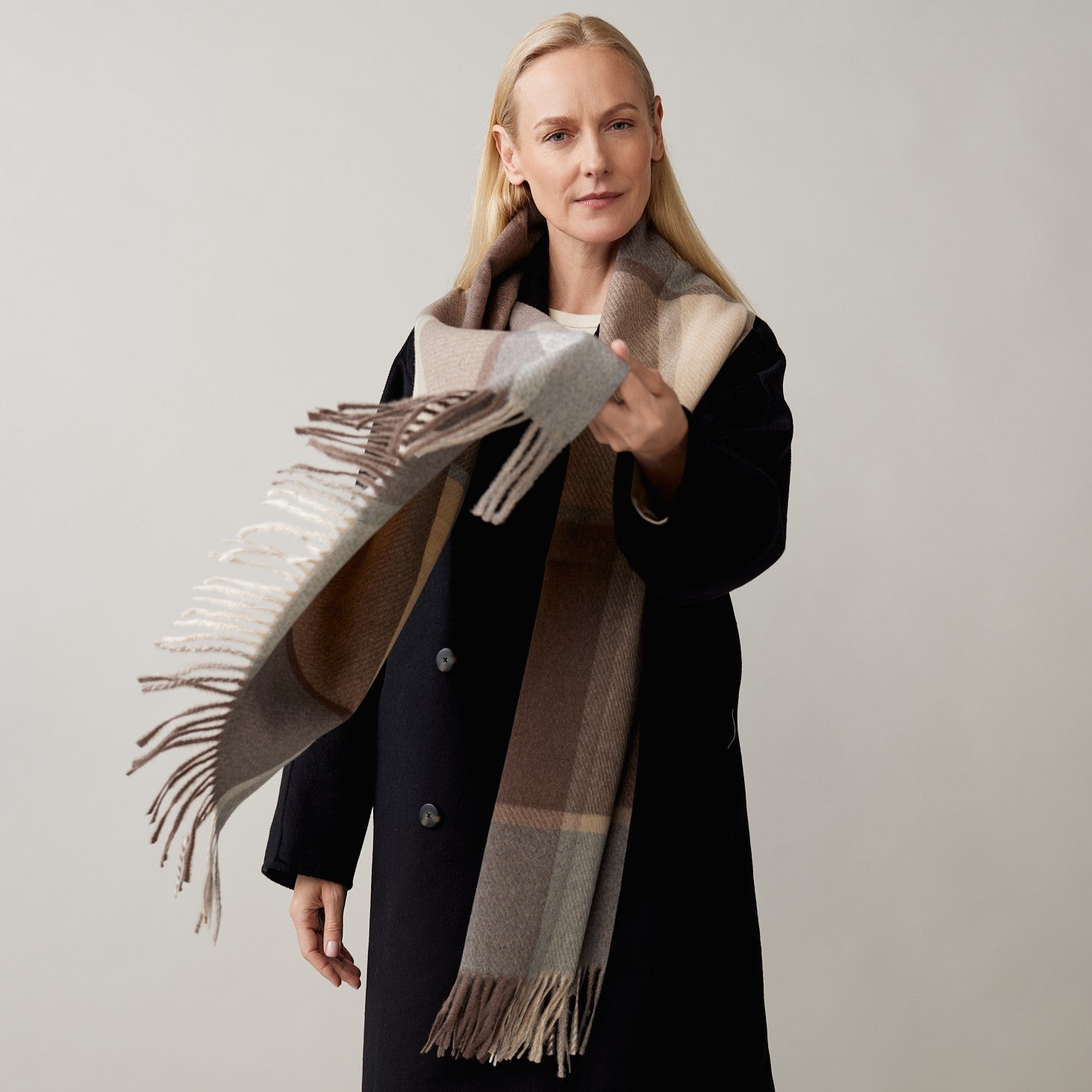 Izgatavota no 30% kašmira vilnas, 35% viskozes, 30% poliestera un 5% akrila, šis aksesuārs izceļas ar maigumu, izturību un lieliski papildina dažādus tēlus.