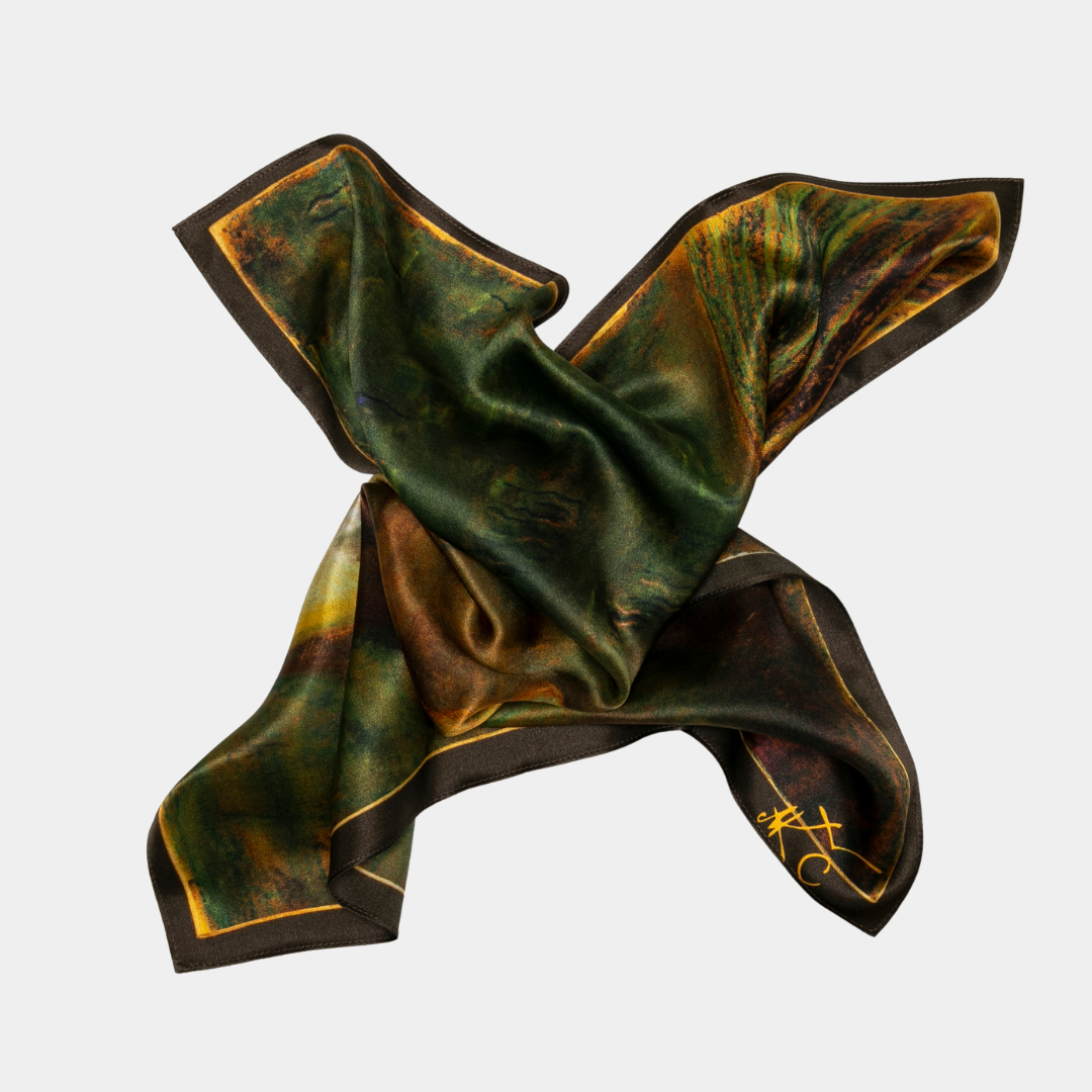 M.K. Čiurlionis ir viens no ievērojamākajiem Lietuvas simbolistiem, kura daiļradi iedvesmo mūzika, daba un dziļas filozofiskas idejas. Viņa gleznas, piepildītas ar mistiku un smalku estētiku, atdzīvojas šajā greznajā zīda lakatā.