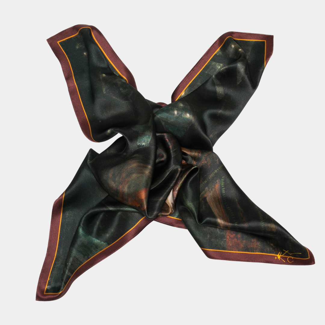 M.K. Čiurlionis ir viens no ievērojamākajiem Lietuvas simbolistiem, kura daiļradi iedvesmo mūzika, daba un dziļas filozofiskas idejas. Viņa gleznas, piepildītas ar mistiku un smalku estētiku, atdzīvojas šajā greznajā zīda lakatā.